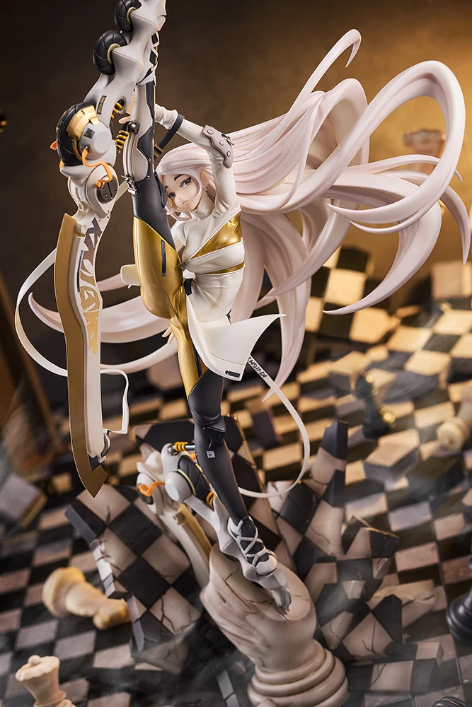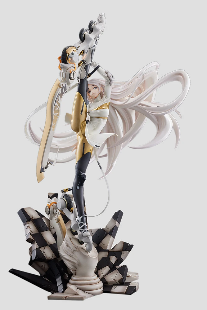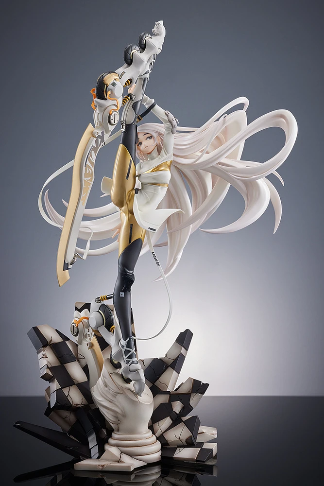 Sculptor Hofi and RIBOSE are proud to present a spectacular 1/7 scale figure of W-kn [G]! Based on artwork from TZ BARD’s B&W illustration series, W-kn [G] is the White Knight bishoujo that smashes classical and cyber aesthetics together in one phenomenal package! Dressed in white and shiny gold, W-kn [G] performs a perfect high kick that points straight up. She’s outfitted with massive killer roller blades. Literally, there are blades on her skates that will kill you! As if that amount of dynamism wasn’t enough, W-kn [G] is surrounded by over a dozen silky white tresses of hair whipping violently from her motion!