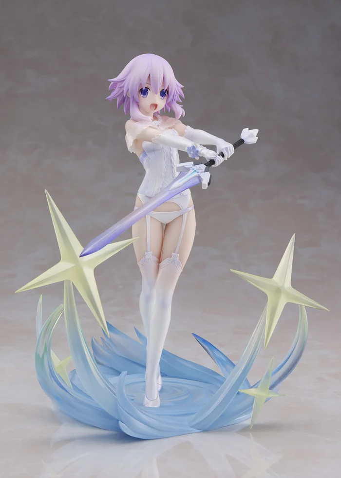 Fans can now enjoy the third Hyperdimension Neptunia OVA Hidamari no Little Purple on Blu-ray, and best of all, this Limited Edition set comes with a 1/7 scale figure of Little Purple wrapped in the radiance of the Share Crystal! Produced by Broccoli and sculptor Honoka, she wears a gorgeous pure white dress and has a whimsical appearance as she wields her ceremonial sword. Her dress looks fantastic with its layered ruffles, lace, and floral details, and her fairy-like wings are made with translucent parts as is the detailed base, which swirls up around her, completing the beautiful composition. Also included is an alternate face part, and for a more daring look, you can even remove her veil and skirt!