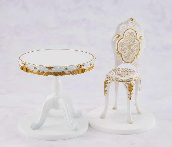 Highlights include the fine sculpting and painting of her outfit including its frills and the way her long sleeves drape down to the floor with a gentle movement, her bright, cheerful expression, and her long silver hair that flows down her back. A table and chair with ornate gold details are also included to create the scene. Display her together with